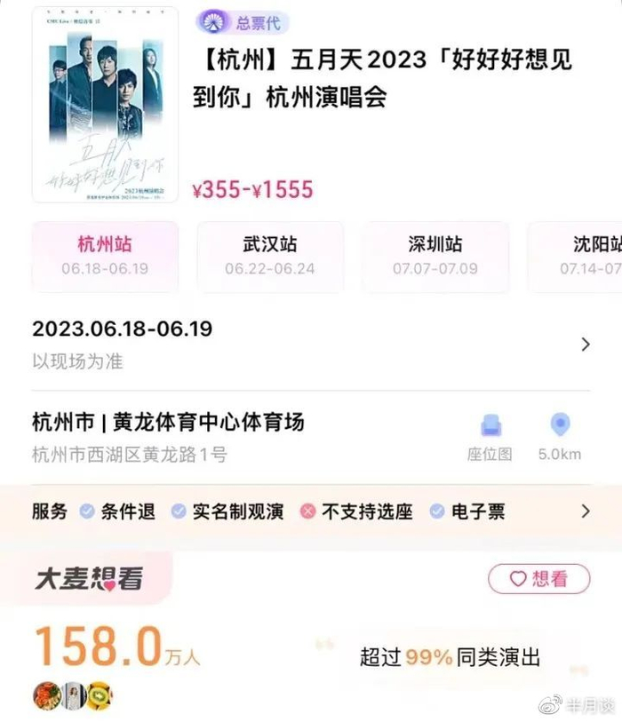 五月天演唱会主办方华乐非凡也曾在官方微博发文表示:为响应严打“黄牛”高价炒票的要求,在有关部门的严格监督下,我司将全部可售票分配至大麦/纷玩岛/猫眼三家官方授权票务平台公开销售。