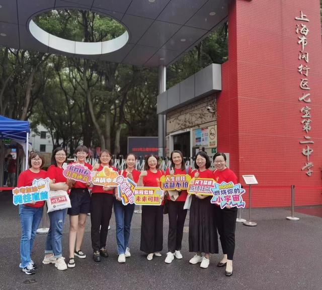 上海市闵行区七宝第二中学考点,来自上海市民办复旦万科实验学校的教师们身穿“金榜题名”“全力以赴”的红色送考衣,手举祝福牌,祝考生们“突飞猛进、成绩狂飙”“人生开挂、啥都不怕”“长得好看、分数还高”。