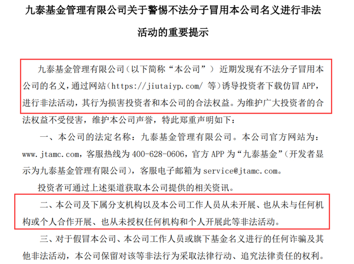 根据九泰基金公告,九泰基金及下属分支机构以及公司工作人员从未开展、也从未与任何机构或个人合作开展、也从未授权任何机构和个人开展此等非法活动。对假冒公司、公司工作人员或旗下基金名义进行的任何诈骗及其他非法活动,九泰基金保留对该等非法行为采取法律行动、追究法律责任的权利。投资者需注意辨别真伪,对非法活动保持警惕,保护自身隐私和财产权益不受侵害。不要扫描来源不明的二维码图片或点击来源不明的链接下载相关APP,如发现有冒用本公司名义的不法行为,可立即向公安机关、监管部门举报。