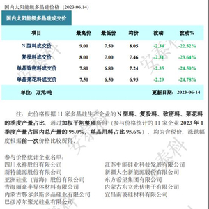 中国有色金属工业协会硅业分会数据显示,本周国内N型料价格区间在7.5-9.0万元/吨,成交均价为8.05万元/吨,周环比降幅为22.52%;单晶致密料价格区间在6.80-7.80万元/吨,成交均价为7.24万元/吨,周环比降幅为24.5%。