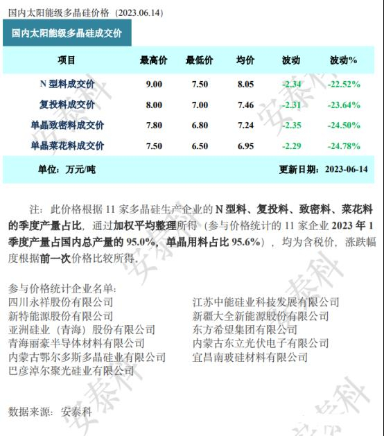 六月虽然出现个别硅料企业减产,甚至停产,但是由于硅料环节产能基数庞大、叠加新产能陆续释放,整体产量预计增至53.5-54.5GW/月,单月产出量环比继续增加。颗粒硅产能逐步增长,硅料环节现货库存继续堆高风险加剧,价格加速下滑速度加快。