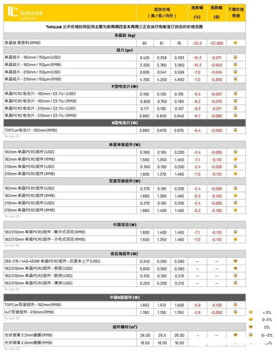 在N型电池片部分,本周TOPCon(M10)电池片价格也对应硅片价格下跌,成交价格普遍落在每瓦0.87元人民币左右。观察N型电池片与P型价格价差仍有每瓦9分钱人民币左右。HJT(G12)电池片外卖厂家稀少,价格也跟随主流电池片价格松动跌价,落在每瓦1.05元人民币不等,预期本周将有望来到每瓦1元人民币的水位。