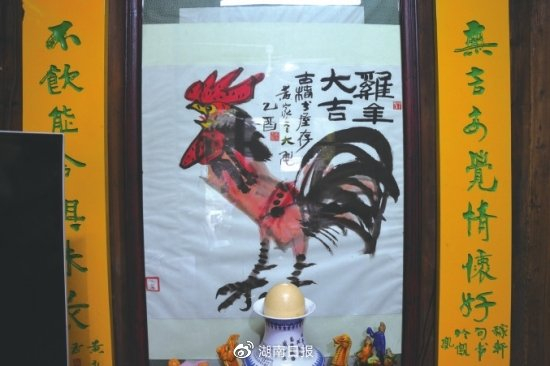 黄永前家的客厅里挂着黄永玉画的雄鸡,这是黄永玉送给属鸡的弟弟的礼物。