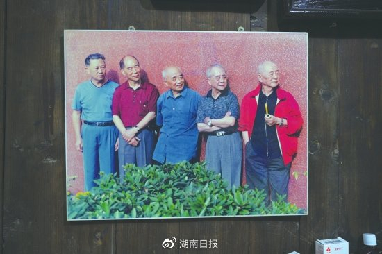 堂屋正堂墙壁上,挂着一张黄永玉的画作。一只大公鸡,是大哥专门给黄永前画的,黄永前属鸡。两侧墙壁也挂满黄永玉老人和其他一些家人的画作,以及家族各类的合照。其中有两张照片比较起眼,一张是黄永玉老人五兄弟的彩色合照,另一张年代更早的合照,照片中间有一位白发老人,那是黄永玉的表叔沈从文。后一张照片的摄影者正是黄永前,拍摄于上个世纪八十年代,那款刚刚出来的相机还是黄永玉送给他的。