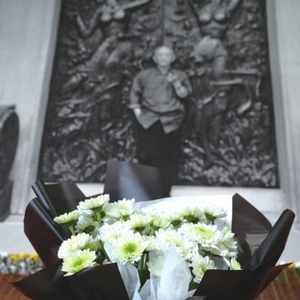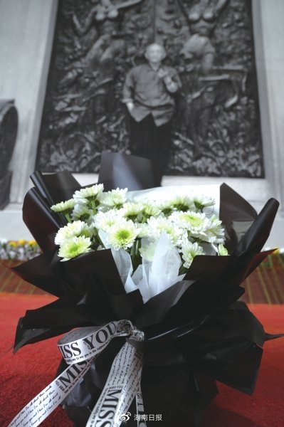 6月15日,吉首大学,黄永玉艺术博物馆里,黄永玉先生的大幅照片下摆放着鲜花。组图/记者吴琳红