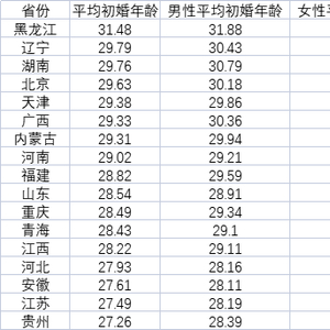 在17个省份中,东北的黑龙江和辽宁位居前两位,其中黑龙江平均初婚年龄达到31.48岁,辽宁的平均初婚年龄达到29.79岁,也接近30岁。其中,辽宁的男性平均初婚年龄已经达到30.43岁。