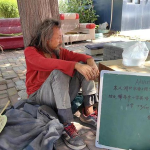 路人看到他的时候,一下就想起了“流浪大师”沈巍。5月初,他被衡水大营镇的主播发现的时候,就睡在马路中间,白天支起一块小黑板,上面写着他们看不懂的英语,据说,黑板的主人拥有研究生学历。