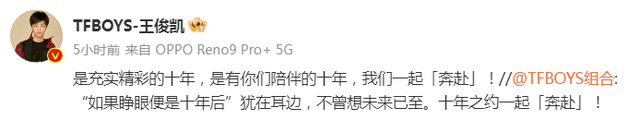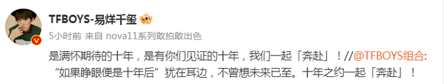 此次消息一出,引发歌迷们的广泛关注和热议。消息一出,歌迷们激动不已。“三小只”也发文与歌迷相约奔赴这场盛夏盛典。王俊凯:“是充实精彩的十年,是有你们陪伴的十年,我们一起“奔赴”!”王源:“是无限惊喜的十年,是有你们支持的十年,我们一起“奔赴”!”易烊千玺:“是满怀期待的十年,是有你们见证的十年,我们一起“奔赴”!”