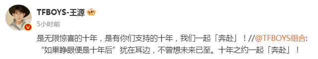 “如果睁眼便是十年后犹在耳边,不曾想未来已至。十年之约一起‘奔赴’!”TFBOYS经纪团队近日宣布TFBOYS十年演唱会将在今年夏天举办。其组合官方微博发文,随后,王俊凯、王源、易烊千玺分别转发十年之约的官宣微博。