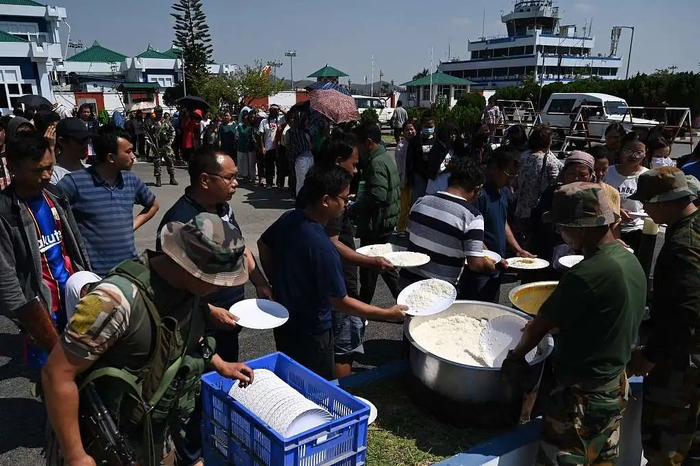 当地时间2023年5月7日,印度曼尼普尔邦英帕尔,当地爆发部落冲突,人们在英帕尔机场排队等待印度军队发放食物。视觉中国 资料图