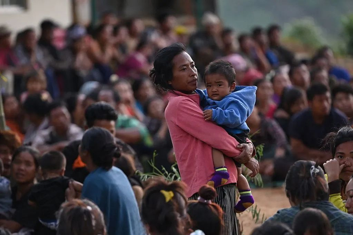 当地时间2023年5月7日,印度曼尼普尔邦,当地发生种族暴力事件,人们在被印度军队疏散后,在军营的临时避难所等待。视觉中国 资料图