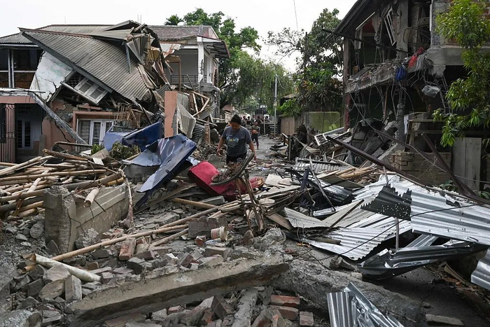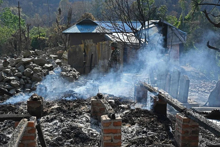 当地时间2023年5月8日,印度曼尼普尔邦,Senapati地区发生部落冲突,一名印度士兵正在检查遭暴徒纵火的房屋残骸。视觉中国 资料图