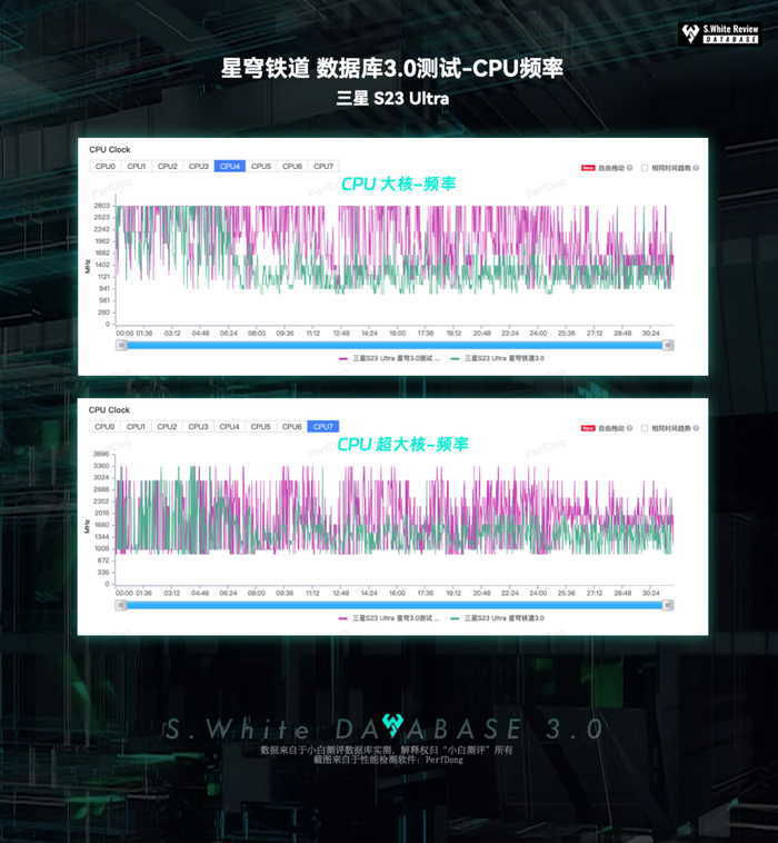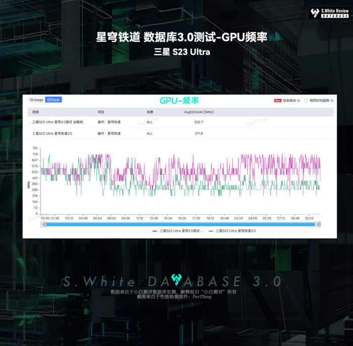 功耗上,加散热背夹相比不加高了2.1W,这主要是不加散热器时CPU、GPU出现降频:可以看出CPU的大核、超大核在6分钟左右出现明显的降频,GPU的频率两则相差很大(GPU频率最高可以到719MHz)