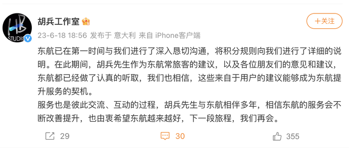东航已在第一时间与我们进行了深入恳切沟通,将积分规则向我们进行了详细的说明。在此期间,胡兵先生作为东航常旅客的建议,以及各位朋友们的意见和建议,东航都已经做了认真的听取,我们也相信,这些来自于用户的建议能够成为东航提升服务的契机。