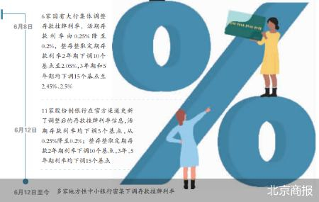 中小银行下调存款利率是跟随此前国有大行、股份制银行降息的“补降”行为。6月8日,六家国有大行集体调整存款挂牌利率,活期存款利率由0.25%降至0.2%,整存整取定期存款利率2年期下调10个基点至2.05%,3年期和5年期均下调15个基点至2.45%、2.5%。不久后的6月12日,11家股份制银行在官方渠道更新了调整后的存款挂牌利率信息,活期存款利率均下调5个基点,从0.25%降至0.2%;2年期整存整取定期存款利率下调10个基点,3年、5年期利率均下调15个基点。