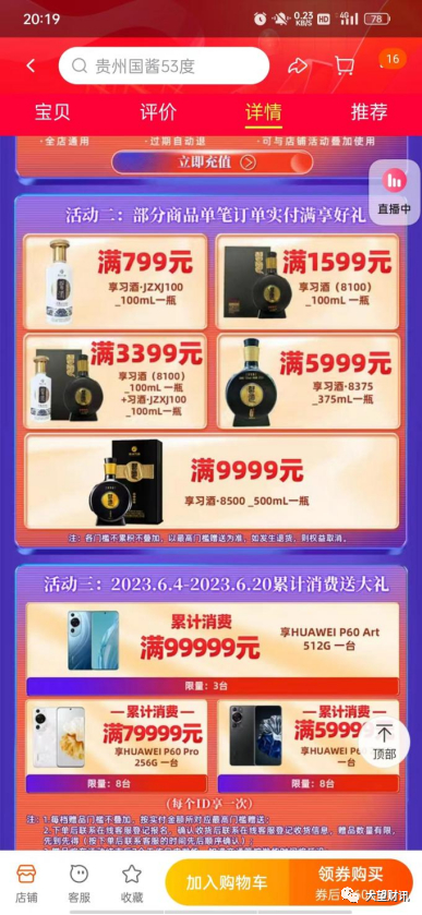 大望财讯查询后发现,目前窖藏1988在习酒官方旗舰店的券后价为608.4元。为提高销量,习酒还推出了“6月4日-6月20日期间累计消费满额赠产品、华为手机”的活动。