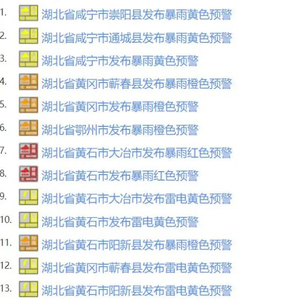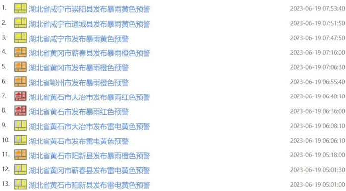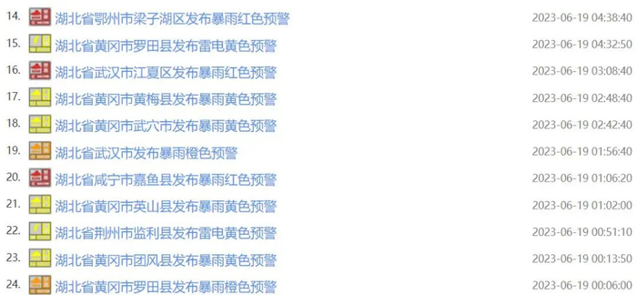 记者从国家预警信息发布中心获悉,从今天(6月19日)零时开始,湖北省多地雷电、暴雨预警连发。截至今早8时,湖北省已连续发布雷电、暴雨预警24条。