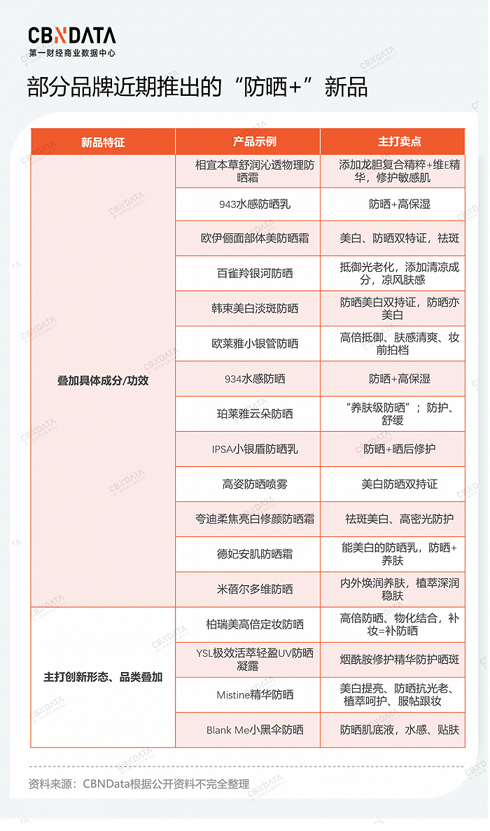 进一步分析品牌近期推出的新品,不难发现其主打卖点集中于烟酰胺、植萃成分以及美白、淡斑、保湿功效,“美白防晒双持证”成为不少新品的核心宣传点。原因也很简单,这些成分或功效本就是当下的“大热门”,品牌端应用与消费端认知都较为成熟,新品的风险较低。但这也意味着新品很难围绕功效讲出全新故事,少数品牌更进一步,推出精华防晒、防晒定妆等不同品类叠加的产品,或避开竞争激烈的防晒霜,推出凝露、水感质地产品。其中,柏瑞美3月份上线的防晒蜜粉饼主打“补妆=补防晒”理念,是国内首个高倍防晒定妆系列产品。