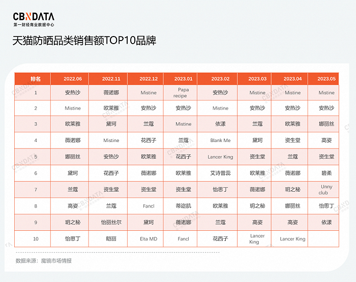 在很长一段时间内,防晒市场的头部品牌以专业防晒品牌、国际美妆大牌为主,国货品牌少有跻身前列者。魔镜市场情报数据显示,天猫防晒品类内,Mistine、安热沙长期占据前两位,欧莱雅、资生堂、兰蔻等品牌的位次虽频繁变动,但也稳居前列。仅有薇诺娜、花西子两个国货品牌能在TOP10品牌中分得两席,其名次提升与大促关联明显,日常销售则相对不足。近两年,还有不少国货品牌涉足防晒、希望拓宽品类布局。因此,关于专业选手与新人的“battle”,更通俗地讲,实际上是国际品牌与国货品牌互相较劲儿。