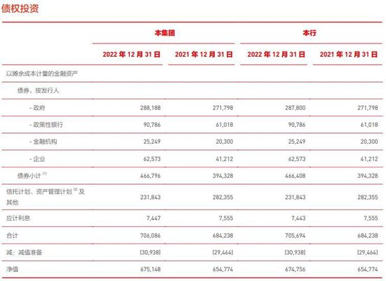 值得注意的是,截止 2022 年底,北京银行投资的债权投资累计有约 7060.9 亿元,其中债券 4668 亿元,信托计划及资产管理计划累计约 2318 亿元,当年度累计减值准备为 309.4 亿元。且近年来,北京银行的债权均遭遇了大额的减值。