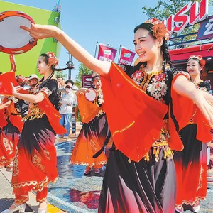 6月18日,独库公路通车仪式举行。图为活动现场精彩的节目表演吸引游客驻足。 (特派独山子全媒体记者史传芝摄)