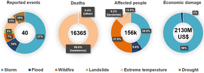 其中,大约67%的事件是与洪水和风暴有关的,占总经济损失的大部分,约20亿美元。就死亡率而言,更严重的原因是热浪,据报道,热浪导致了16000多人的死亡。