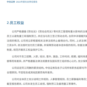 同时,中信证券明确表示:“公司对于员工招聘、入职、培训、晋升、激励、工作时间、假期、福利待遇、解聘等事宜,不因种族、宗教、性别、年龄、婚姻、容貌等而有差异,并严格遵循法律法规要求及国际劳工组织核心公约,充分保障员工权益。”