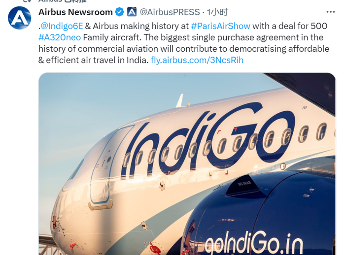 航空业迎来历史性大单!印度靛蓝航空采购500架空客飞机