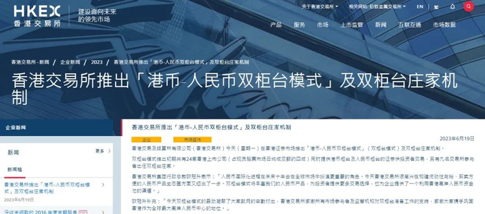 2022年12月13日,香港交易所宣布即将推出“港币-人民币双柜台模式”(双柜台模式)及双柜台庄家机制,进一步支持人民币柜台在香港上市、交易及结算。2023年5月19日,港交所宣布,拟于2023年6月19日推出“港币-人民币双柜台模式”。