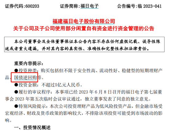 6月9日,上市公司福日电子公告称,为提高闲置自有资金使用效率,在不影响公司正常经营的前提下,公司及子公司拟对自有闲置资金适时进行资金管理,以增加公司收益。本次投资额度不超过5亿元。投资方式包括购买包括但不限于安全性高、流动性好、稳健型的短期理财产品、国债逆回购。