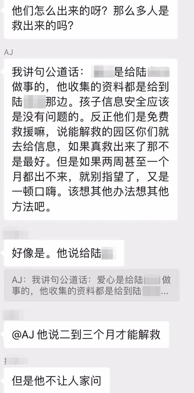 小娜一家就在许多群里看到过骗子。6月3日,小娜进入了一个由被诱骗至境外的受害者家属组成的聊天群,进群后不久,小娜就发现了疑似“托”的痕迹,“他们那群里有好几个人,就一直在说抖音有一个陆某(化名),说这个人可以帮他们把人捞出来,然后让我们去找他,给钱给他,反正所有人都在推这个人。”这位陆某,正是被指造谣的前述某“反诈骗组织”发起人。
