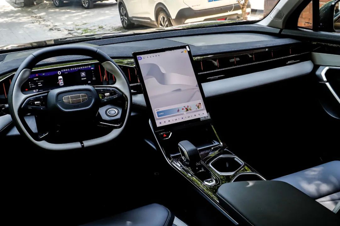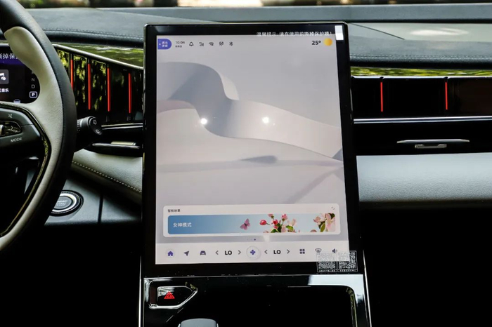 13.2英寸中控屏幕内置高通8155芯片,拥有8核心CPU,16G内存+128G存储,运算更快,响应更迅速。实际使用层面,流畅度非常的丝滑,UI设计清新很有高级感,分辨率1440×1920,屏幕表面增加防反射、防指纹、防眩光膜,体验感还是相当不错的。