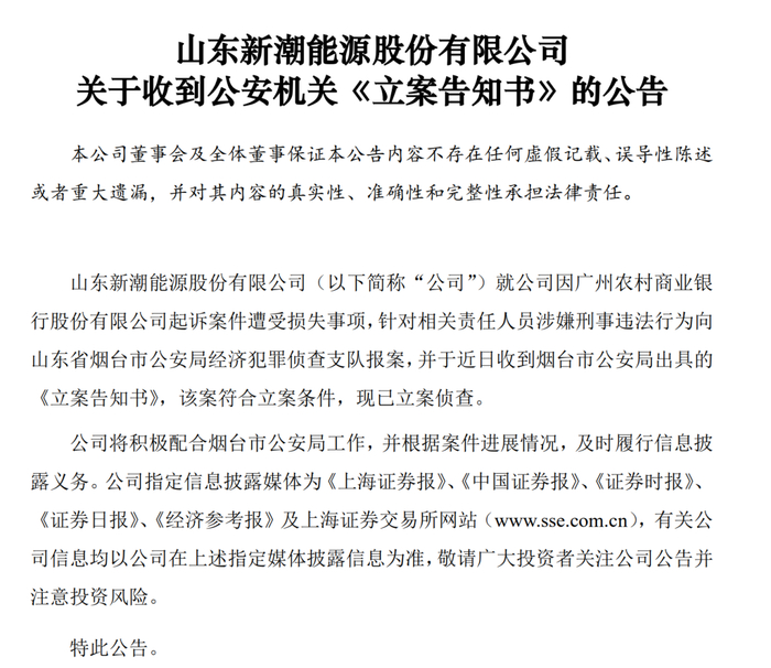 6月19日晚间,新潮能源(600777)发布公告称,新潮能源就公司因广州农村商业银行股份有限公司(以下简称广州农商行)起诉案件遭受损失事项,针对相关责任人员涉嫌刑事违法行为向山东省烟台市公安局经济犯罪侦查支队报案,并于近日收到烟台市公安局出具的《立案告知书》,该案符合立案条件,现已立案侦查。