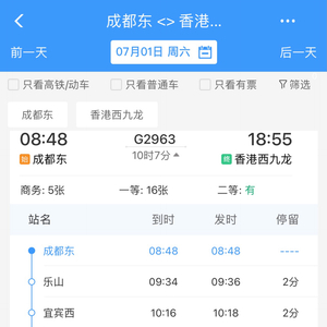 铁路12306显示,7月1日,成都东至香港西九龙直达高铁正式开行。其中,南下G2963次列车上午8时48分从成都东站出发,经停乐山、宜宾西、贵阳东、桂林西、肇庆东、三水南、佛山西、广州南、虎门、深圳北,于18时55分抵达香港西九龙站,全程10小时07分。北上G2964次列车也是朝发夕至,上午10时08分发车,19时53分抵达,全程9小时45分钟。