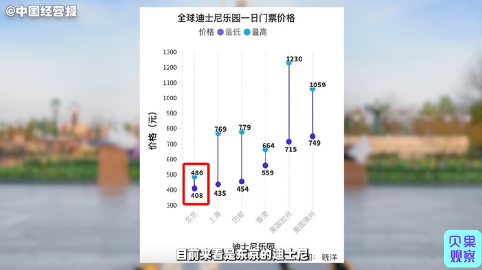 至于上海迪士尼门票,它的最低票价可排到全球第二便宜,最高票价也能跻身平价榜第3位。即使6月涨价后,它的基础票价依然处于全球迪士尼乐园的低位。