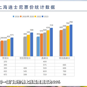 对比刚开园时期,上海迪士尼乐园七年内同一级门票价格上涨幅度最高为60%。目前上海迪士尼乐园基础门票为475元,已高于法国巴黎、日本东京迪士尼乐园的基础门票价格。