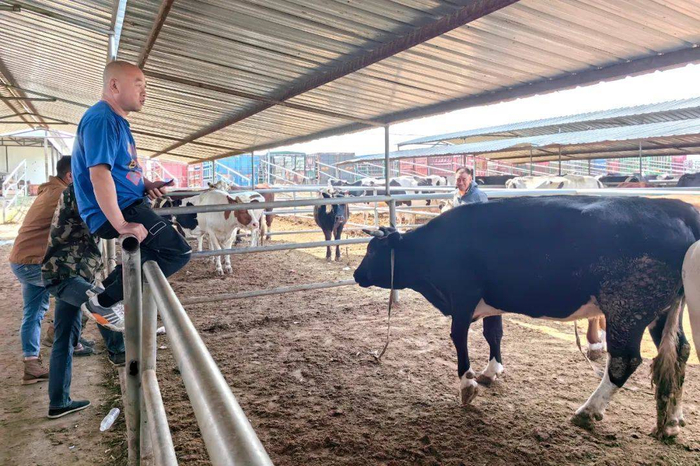 “你看咱这牛,屁股又大又方,体格子老好了,你再看这脖颈上的肉,多厚实。”不远处,养殖户闫师傅与两户买家聊得火热。