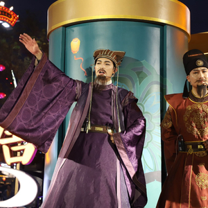 “《兰亭序》的作者是谁?”、“‘凿壁偷光’的主人公是谁?”、“中国四大名山都是什么山?”在大唐不夜城的一个舞台前,众多游客在围观台上穿着古装的出题官“考验”随机邀请的观众。