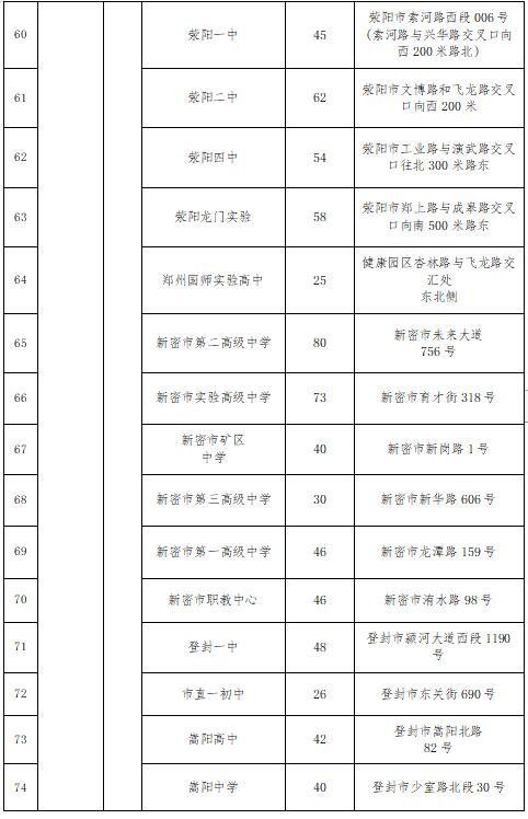 分别为:郑州市第五高级中学考点(地址:郑州市第五初级中学)、郑州市第十中学考点(地址:郑州市商贸管理学校)、郑州市第十七高级中学考点(地址:郑州市第四十七初级中学)、郑州市第四十一、五十六高级中学考点(地址:郑州高新区八一中学)、郑州市第四十四高级中学考点(地址:郑州市第四十四初级中学)、郑州市第一〇二高级中学考点(地址:二七区京广实验中学)、郑州市第一〇七高级中学考点(地址:郑州市第一〇七初级中学)、郑州航空港第一高级中学考点(地址:郑州市桐柏一中)、郑州市第三十六中学考点(地址:郑州市第七十三中学)、郑州航空港区高级中学考点(地址:郑州市第一二二中学)。