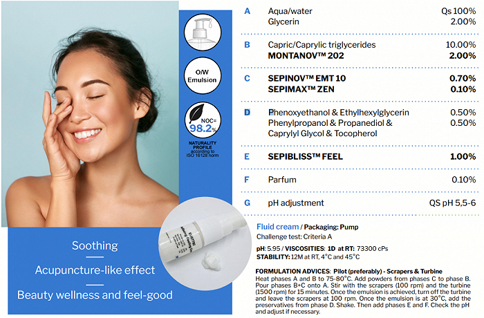 Seppic公司将该成分应用在外用护肤品中,结合其它舒缓类成分及乳化剂,推出了EU07782“愉悦面霜”和EU07779“健康保健按摩油”两款配方。