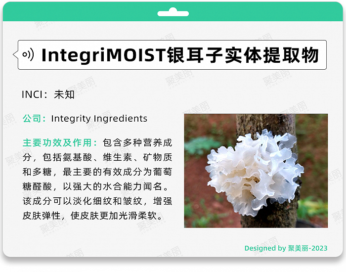 此外,该公司先前推出的IntegriACTIVE 抗刺激复合物(INCI:泛醇、甘草酸二钾、水、透明质酸钠、尿囊素、库拉索芦荟叶提取物、银耳子实体(蘑菇)提取物、植酸钠),其中就包含了银耳子实体提取物和多种植物多糖。