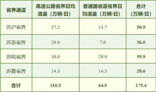 端午期间,预计全省干线公路省界通道日均流量为175.4万辆,较平日增长约8%,其中高速公路省界通道日均流量为110.5万辆,普通国省道省界通道日均流量为64.9万辆。周边相邻四省中,苏皖省界流量最大,达到59.9万辆。
