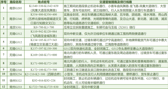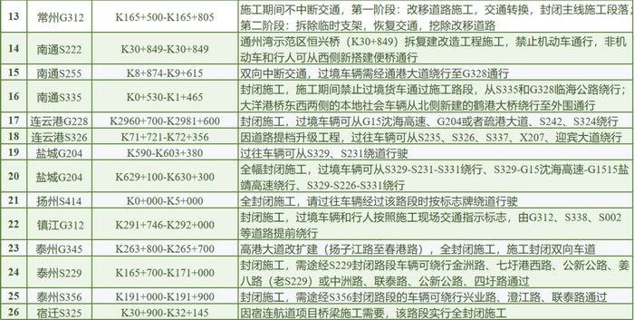 端午期间,全省主要有26处普通国省道路段处于封闭施工状态,其中苏北地区7处,苏中地区7处,苏南地区12处,请过往车辆提前绕行。