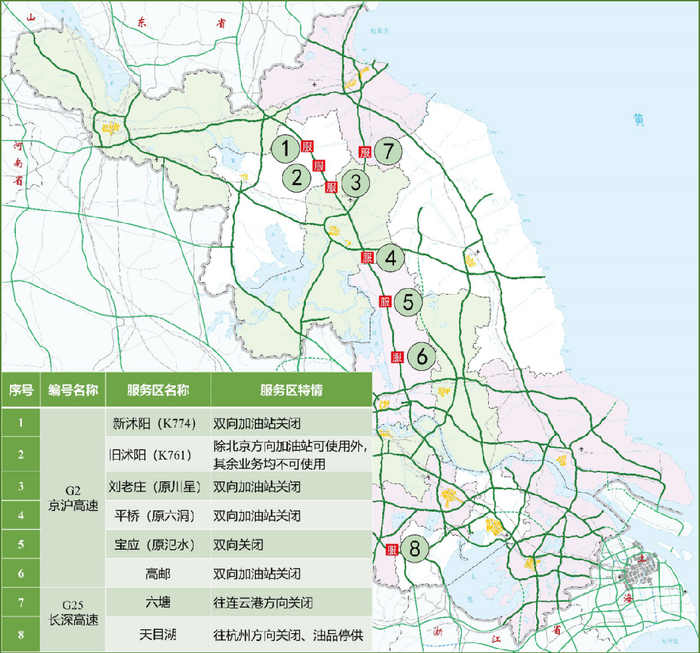 端午期间,共有8个高速服务区有服务区关闭、加油站关闭等特情,其中苏北地区5个,苏中地区2个,苏南地区1个,请注意!