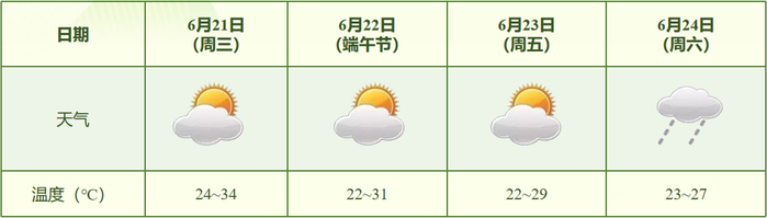 2023年端午放假时间为6月22日-6月24日,共3天!预计全省天气以多云为主,总体适宜出行,天气预报情况如下: