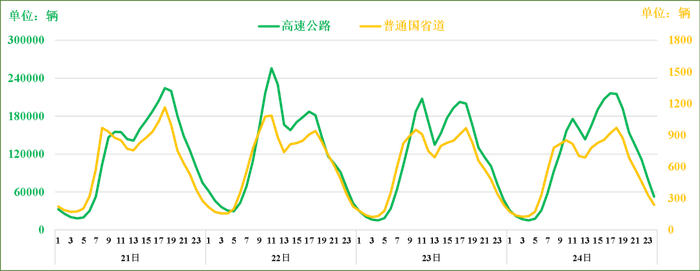 端午期间,高速公路和普通国省道流量均呈早晚双峰分布,早高峰为8时-12时,晚高峰为16时-20时。