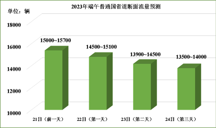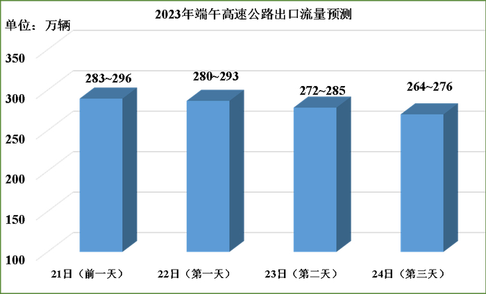 端午期间,全省高速公路日均出口流量预计为272~285万辆,普通国省道日均断面流量预计为14300辆左右,较去年同期分别增长约83%、18%,较2019年同期分别增长约28%、9%。高速公路假期前一天流量达到最高,约为283~296万辆;预计普通国省道节前一天流量最高,为15350辆左右。