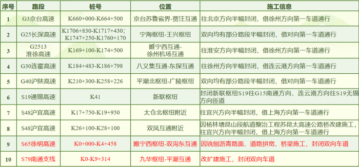 端午期间,省内有G25长深高速、G30连霍高速等10处高速公路施工路段,其中苏北地区5处,苏中地区3处,苏南地区2处,请注意现场交通标志提示!