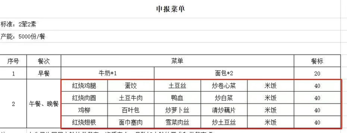 王先生分享了一份业内申报菜单价格表,并表示,餐标为40元的午餐、晚餐,实际供餐公司用10元费用就能保质、保量做出来,如果供餐公司无良,那么还会继续压缩成本,不过出现食品安全问题的概率就会加大。