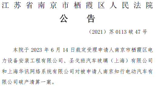 近日,拜腾汽车主要关联公司南京知行新能源汽车技术开发有限公司(以下简称“知行新能源”)和南京知行电动汽车有限公司(以下简称“知行电动车”)的破产清算申请被法院裁定受理。